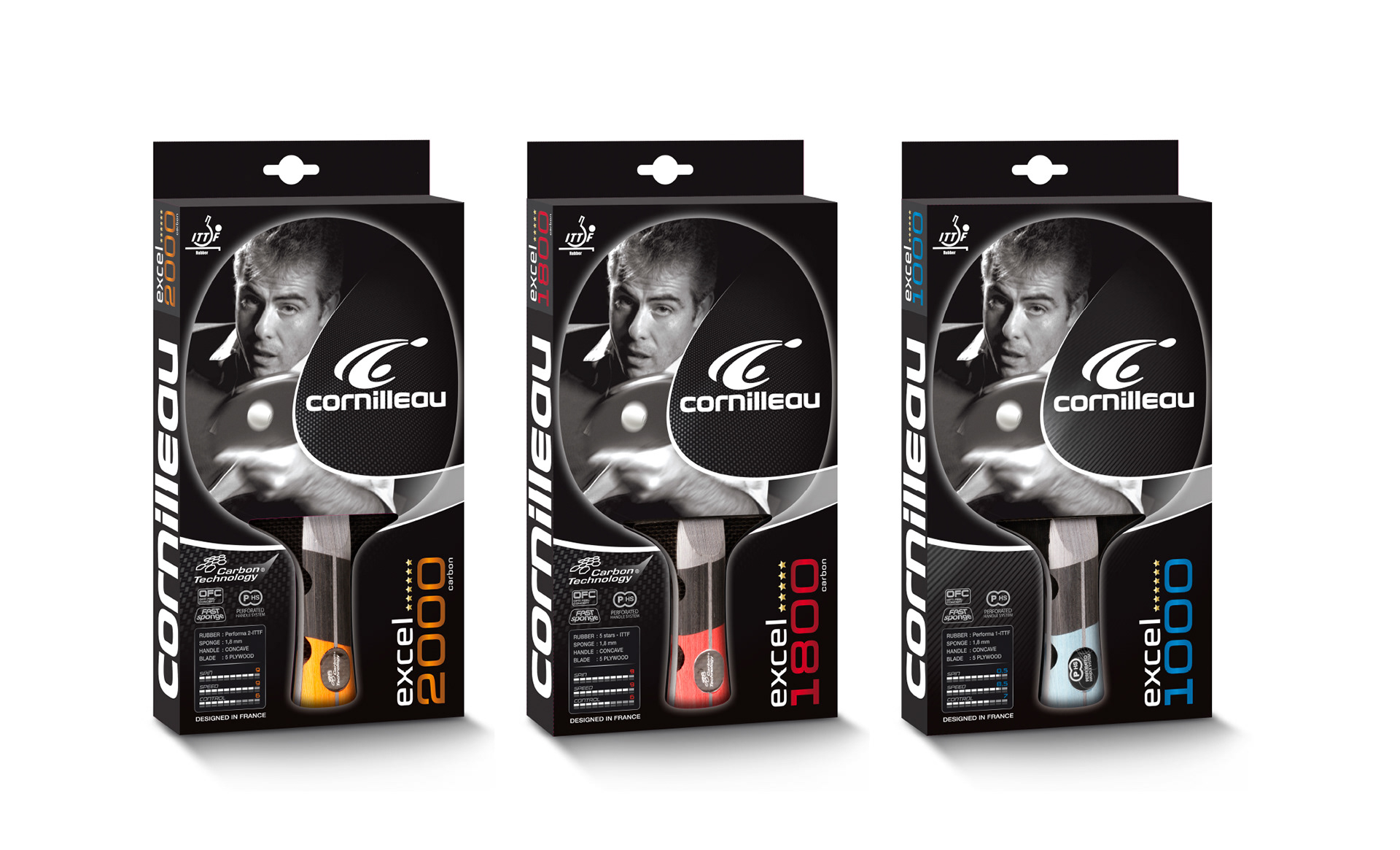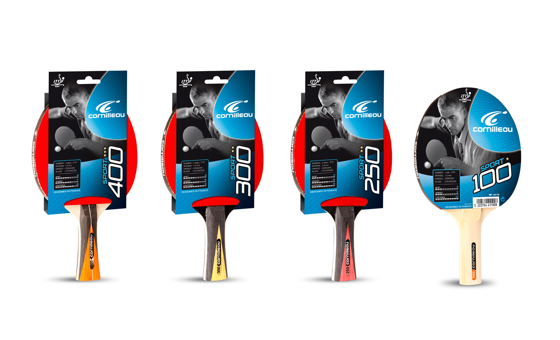 Création graphique des gammes de raquettes de tennis de table de la marque Cornilleau.