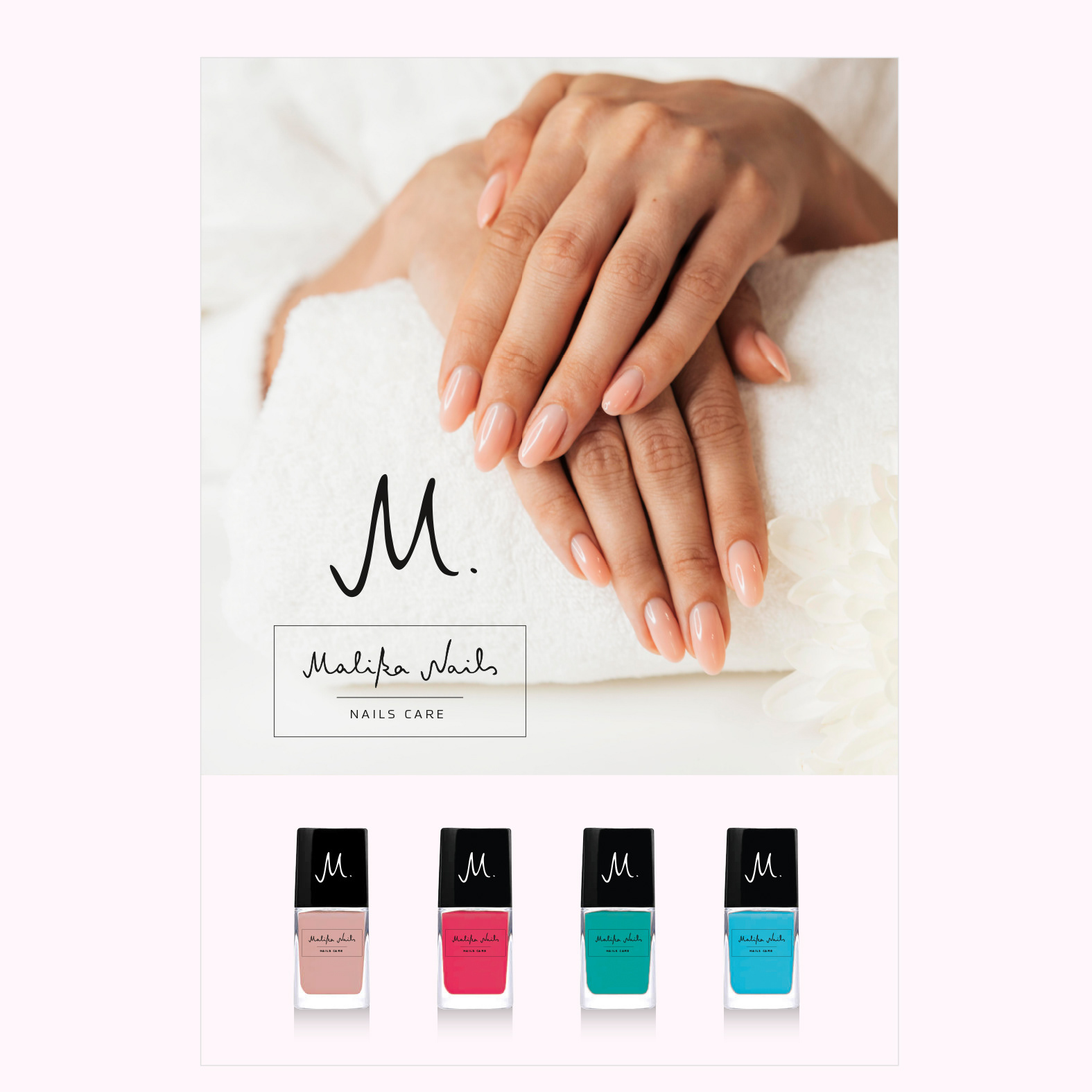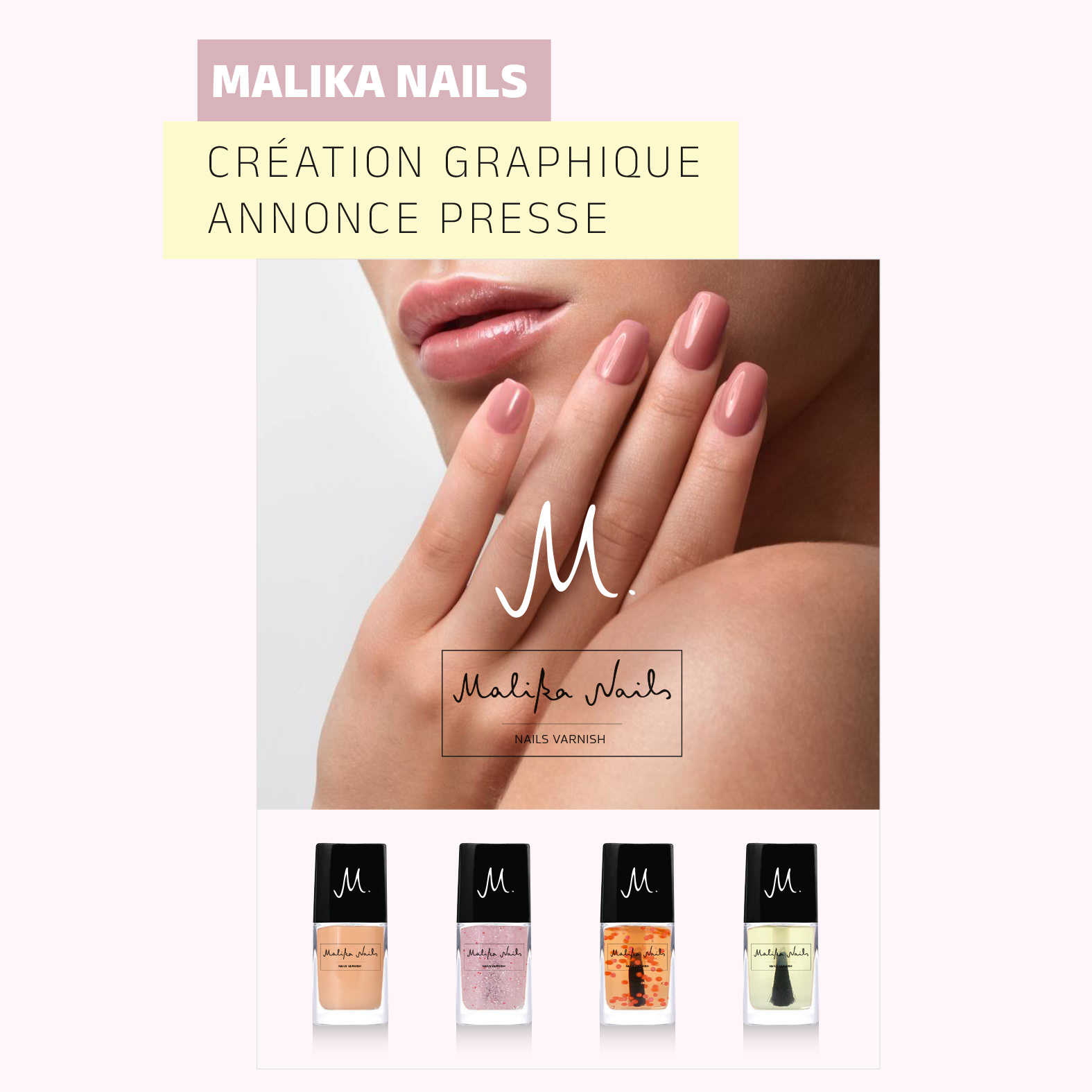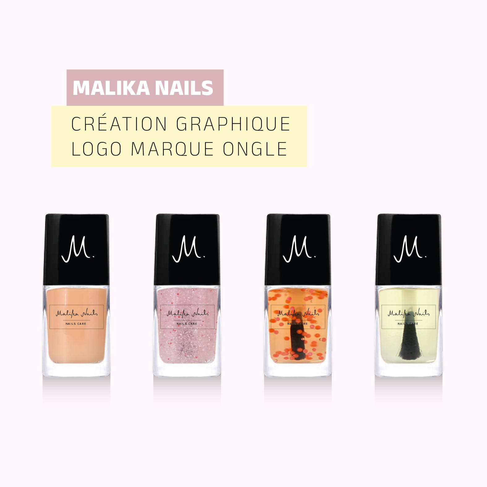 Création du logotype Malika Nails. Création graphique des marquages de la gamme de vernis pour la marque Malika Nails.